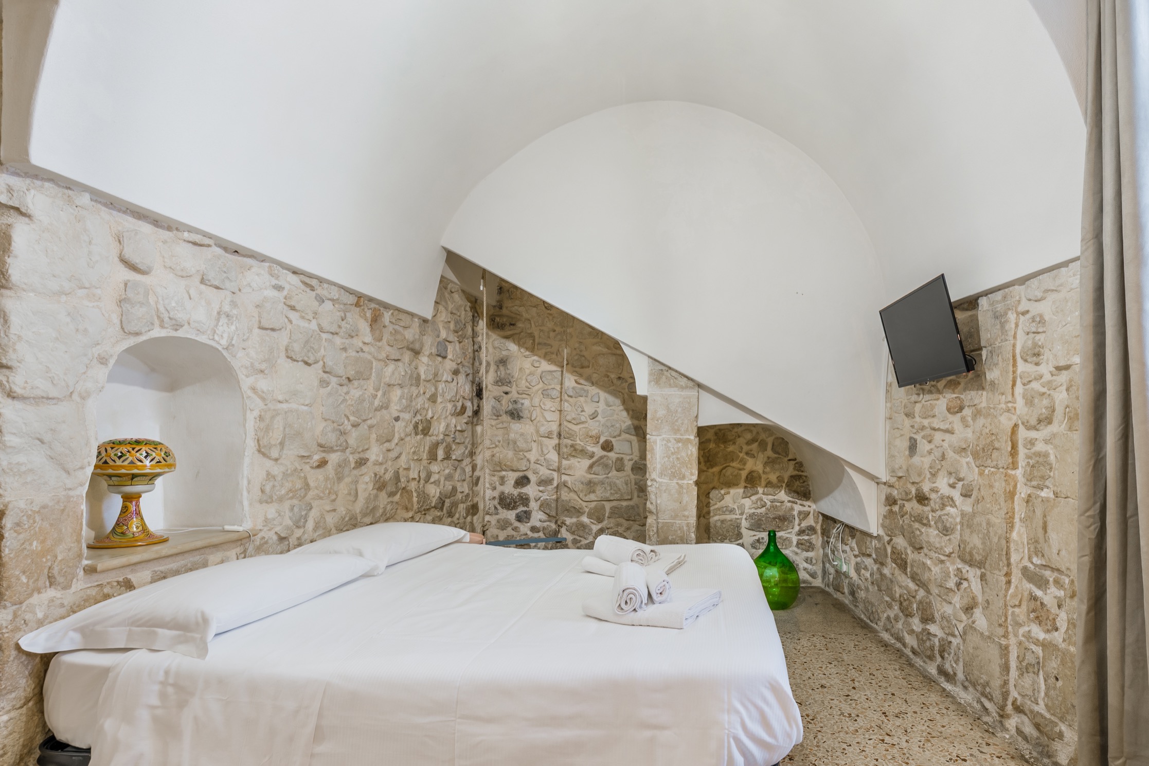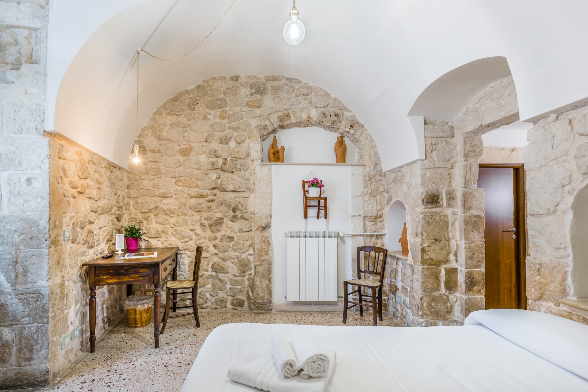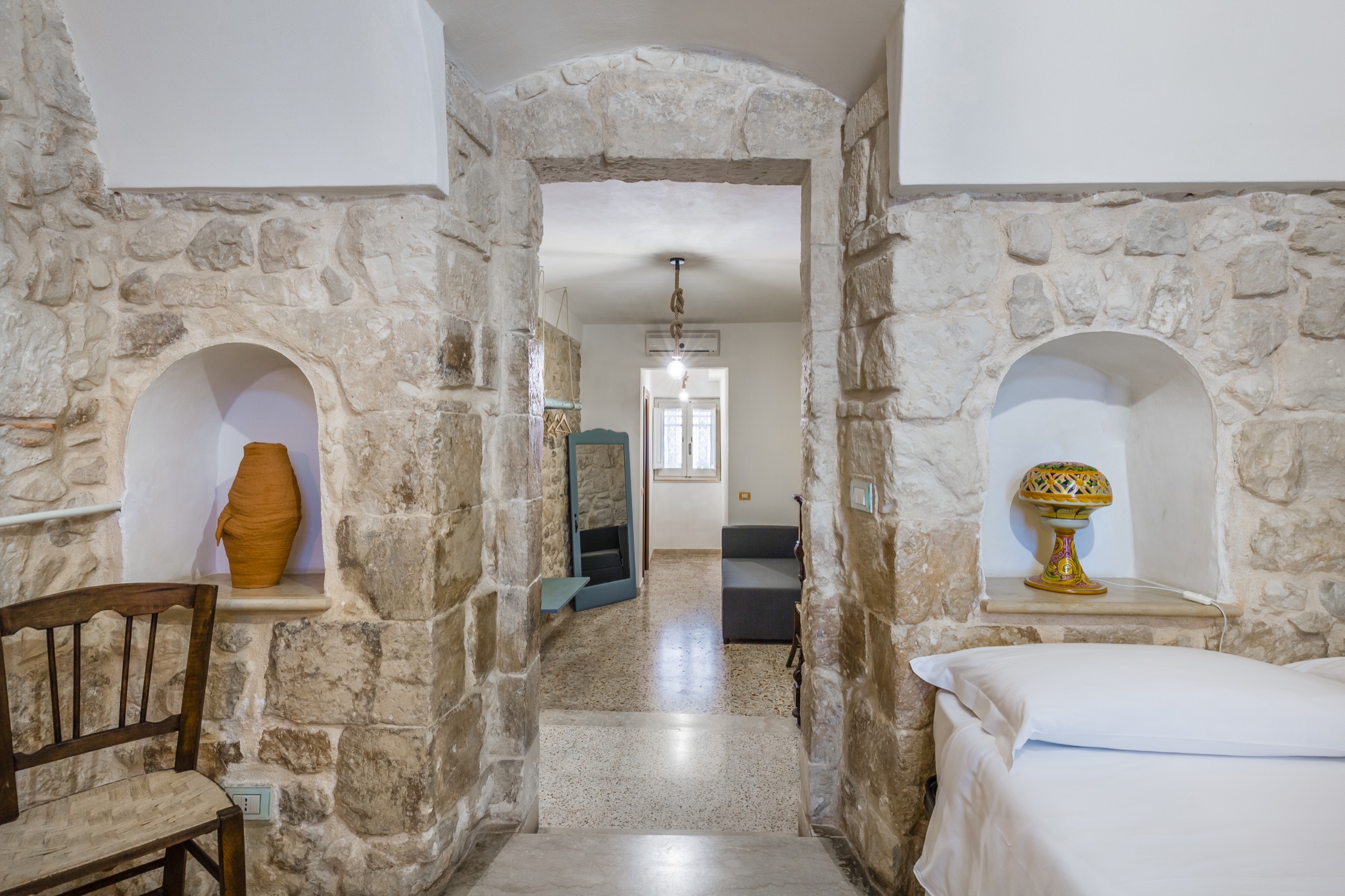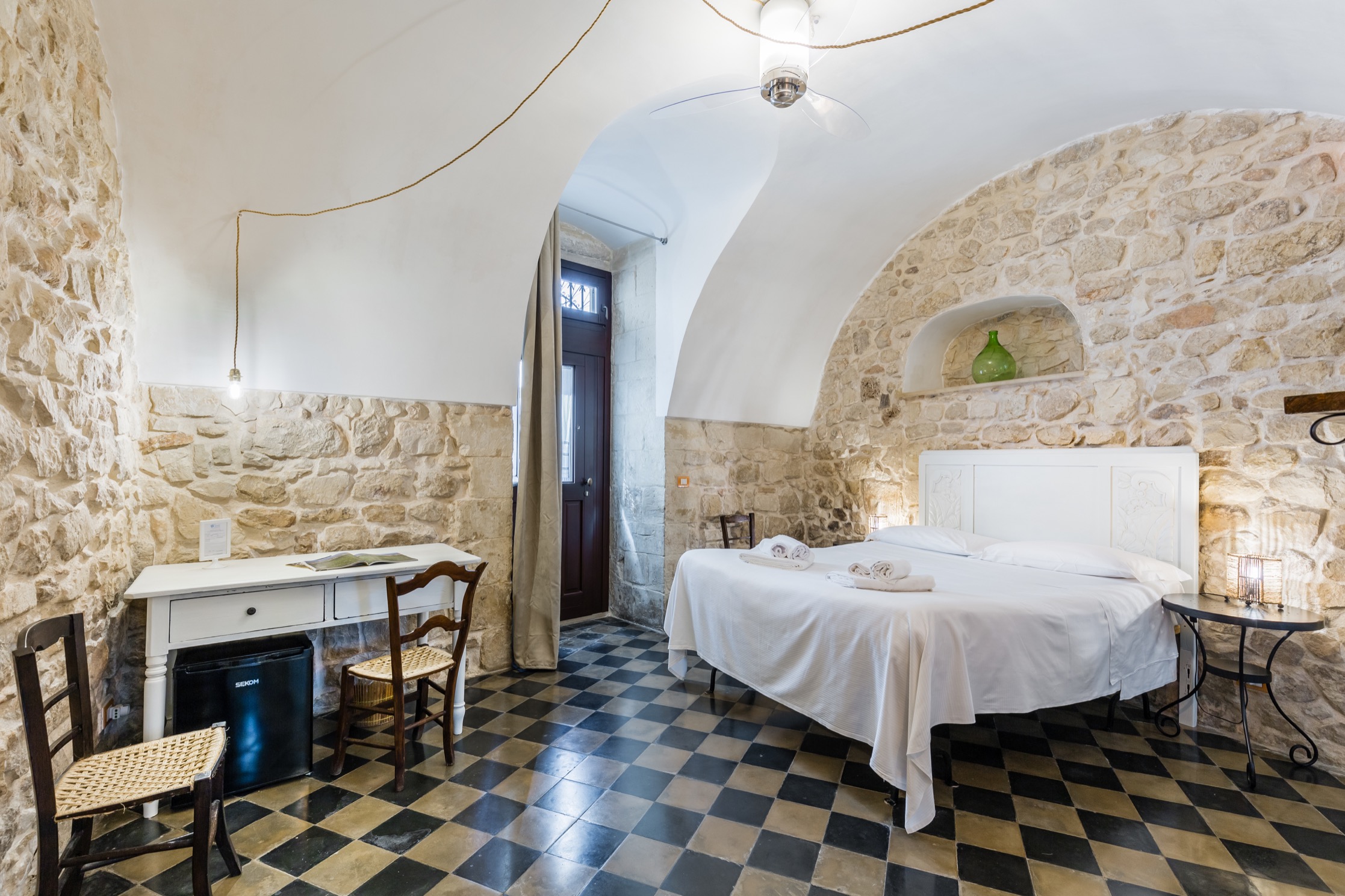 Due Camere hanno l’accesso indipendente e sono quelle del piano terra. Si riconoscono per le spesse pareti in pietra che d’estate generano un piacevole refrigerio naturale e per il tetto con le volte a botte. Entrambe sono arredate con mobili d’epoca e sono dotate di ogni confort: televisore, mini frigo e aria condizionata o ventilata.