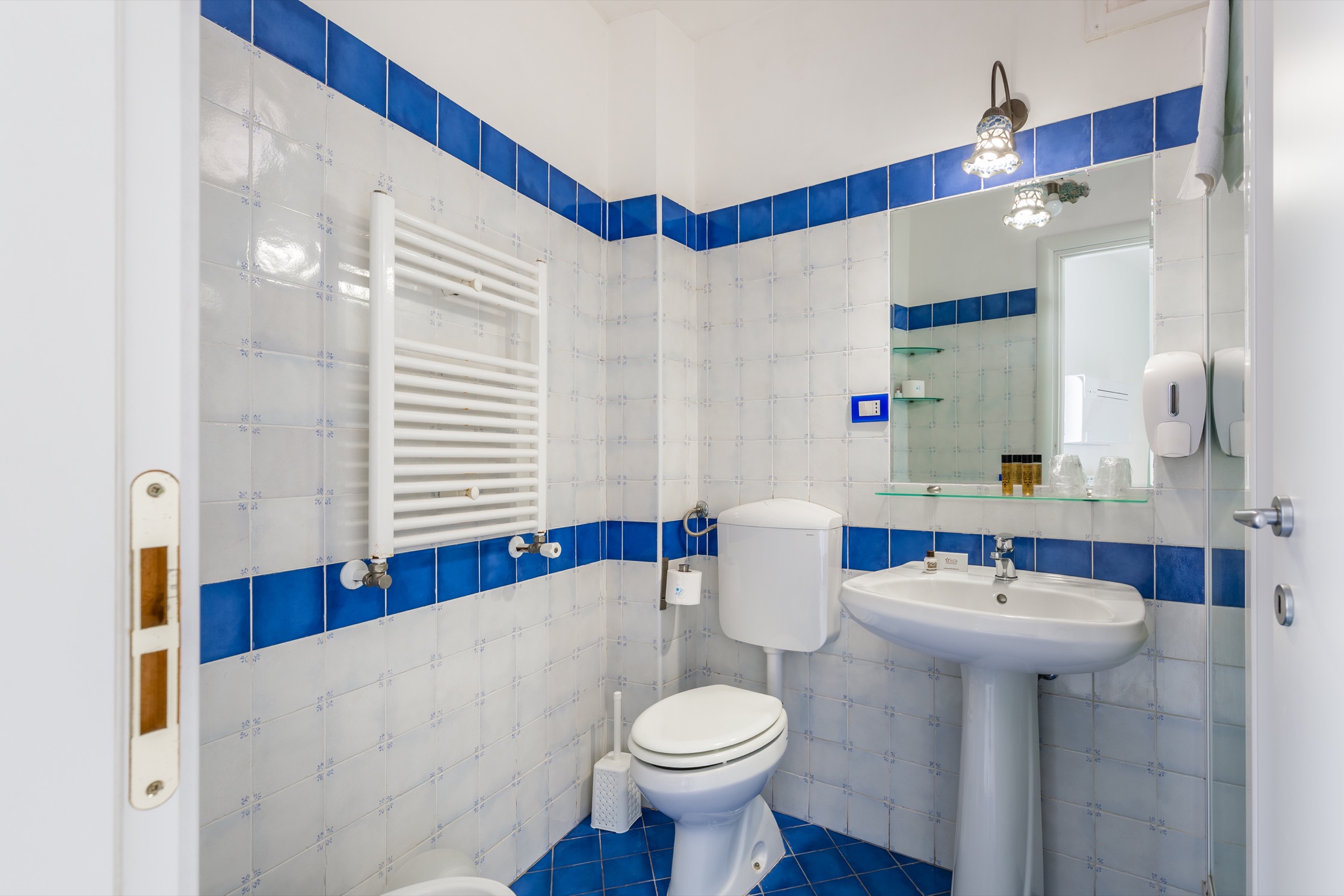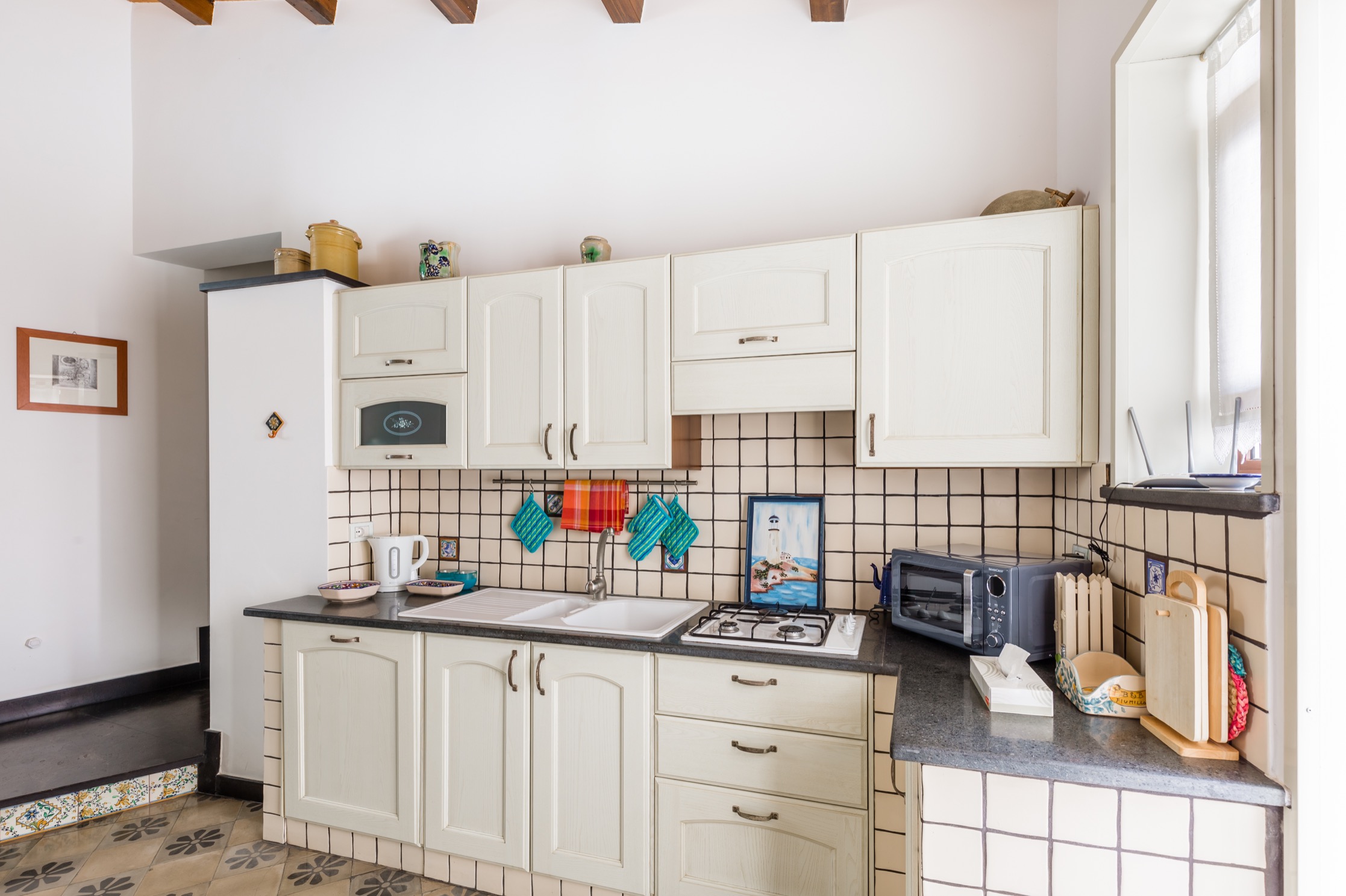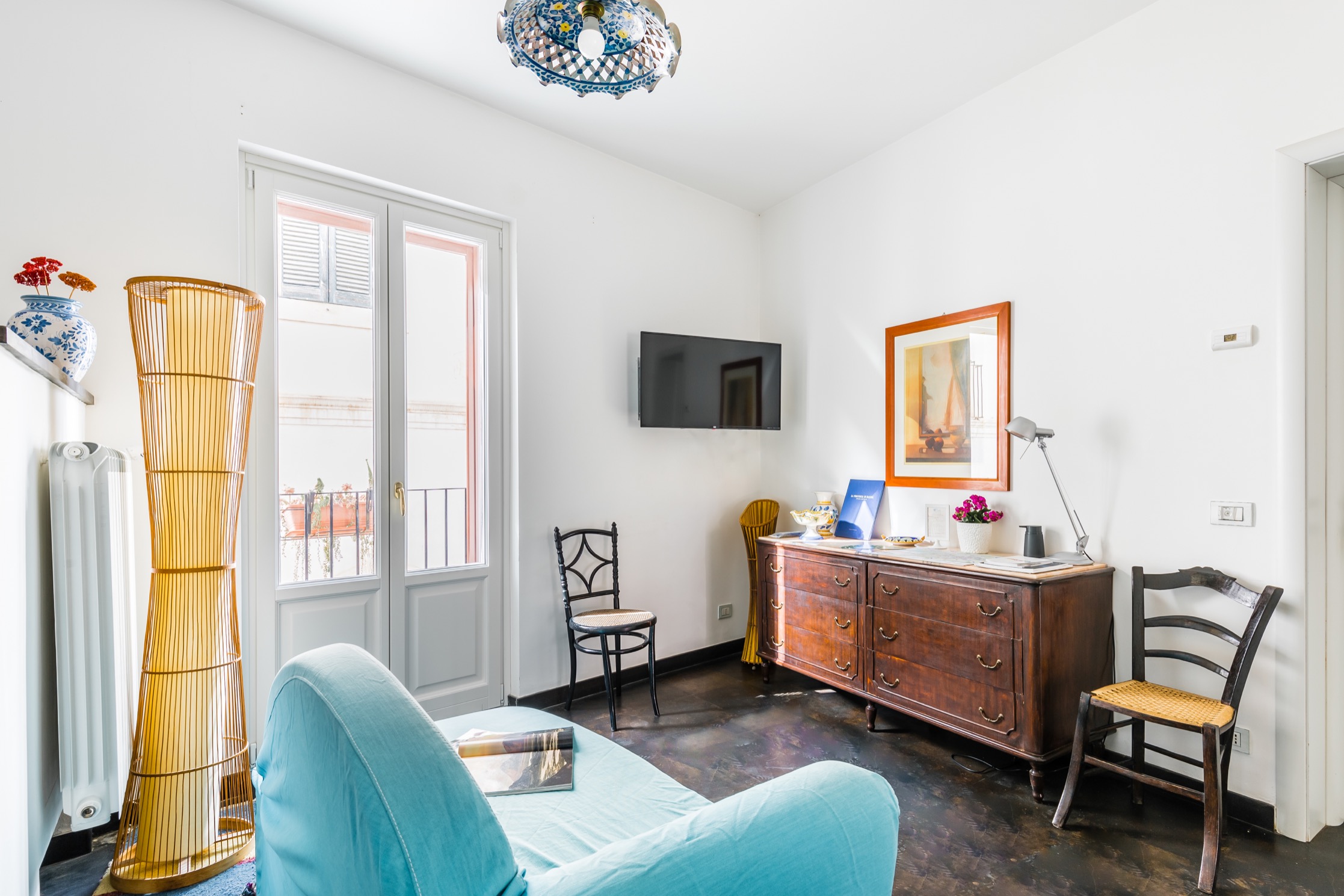 Alle due Camere del primo piano si accede dalla zona living che ospita anche una piccola cucina con frigorifero. I mobili antichi si integrano con armonia a quelli moderni come l’originale divano azzurro ed ai quadri che animano le bianche pareti: sono opere di alcuni esponenti del Gruppo di Scicli.