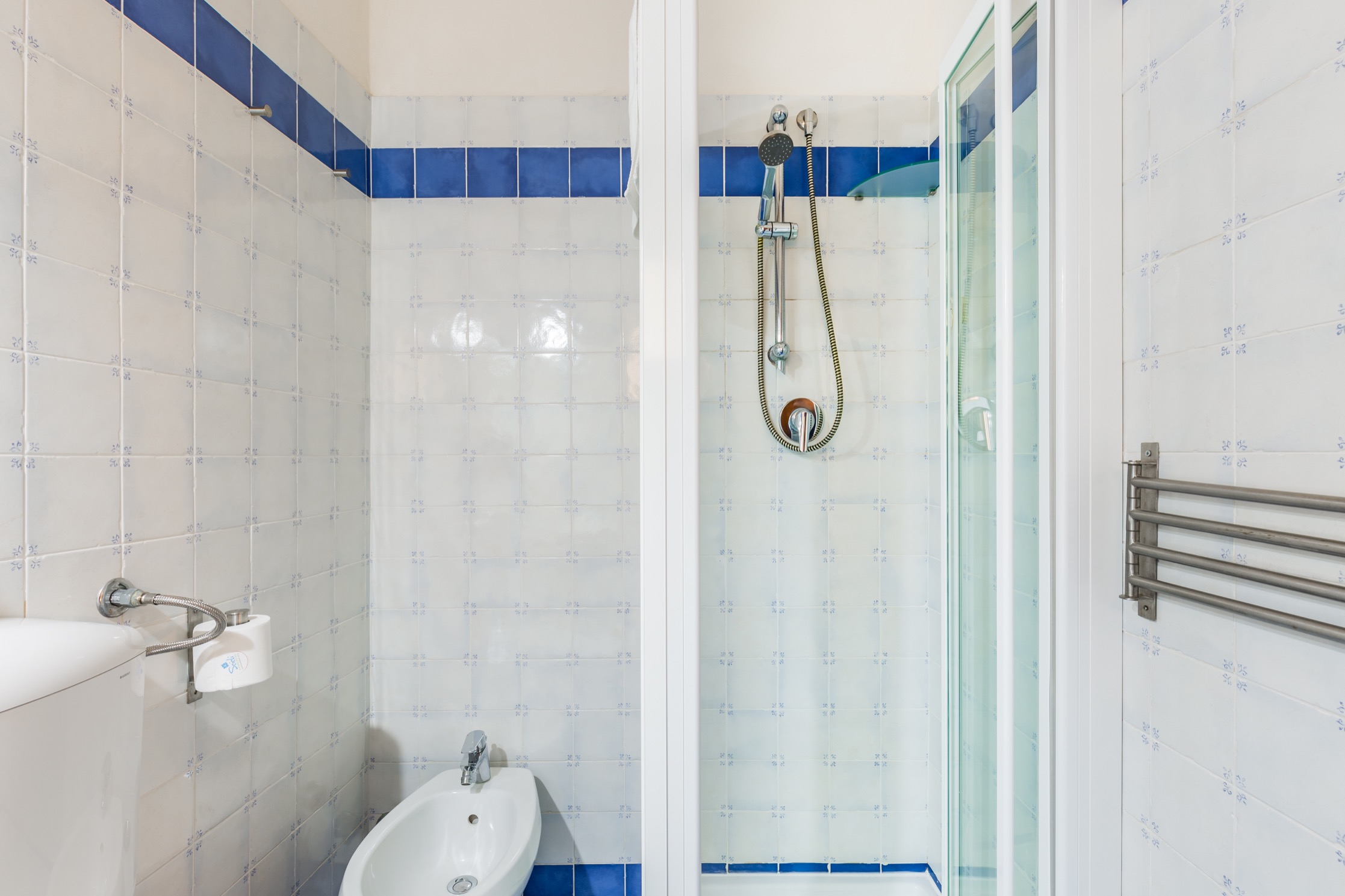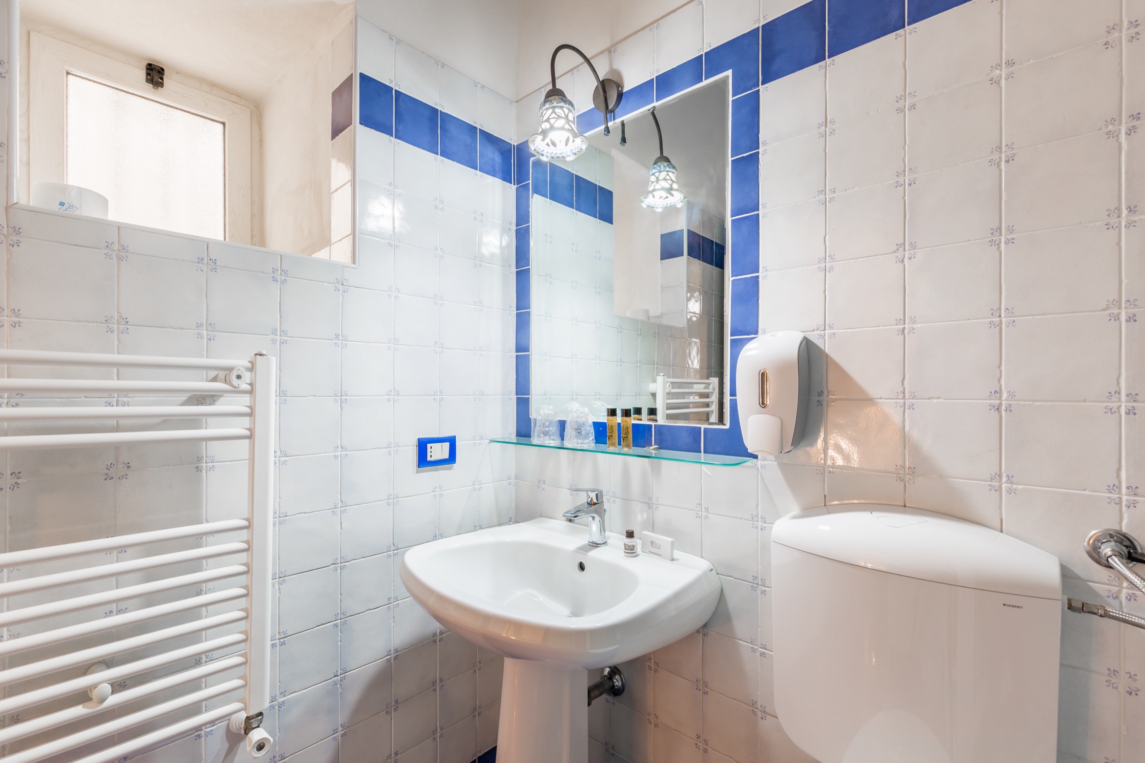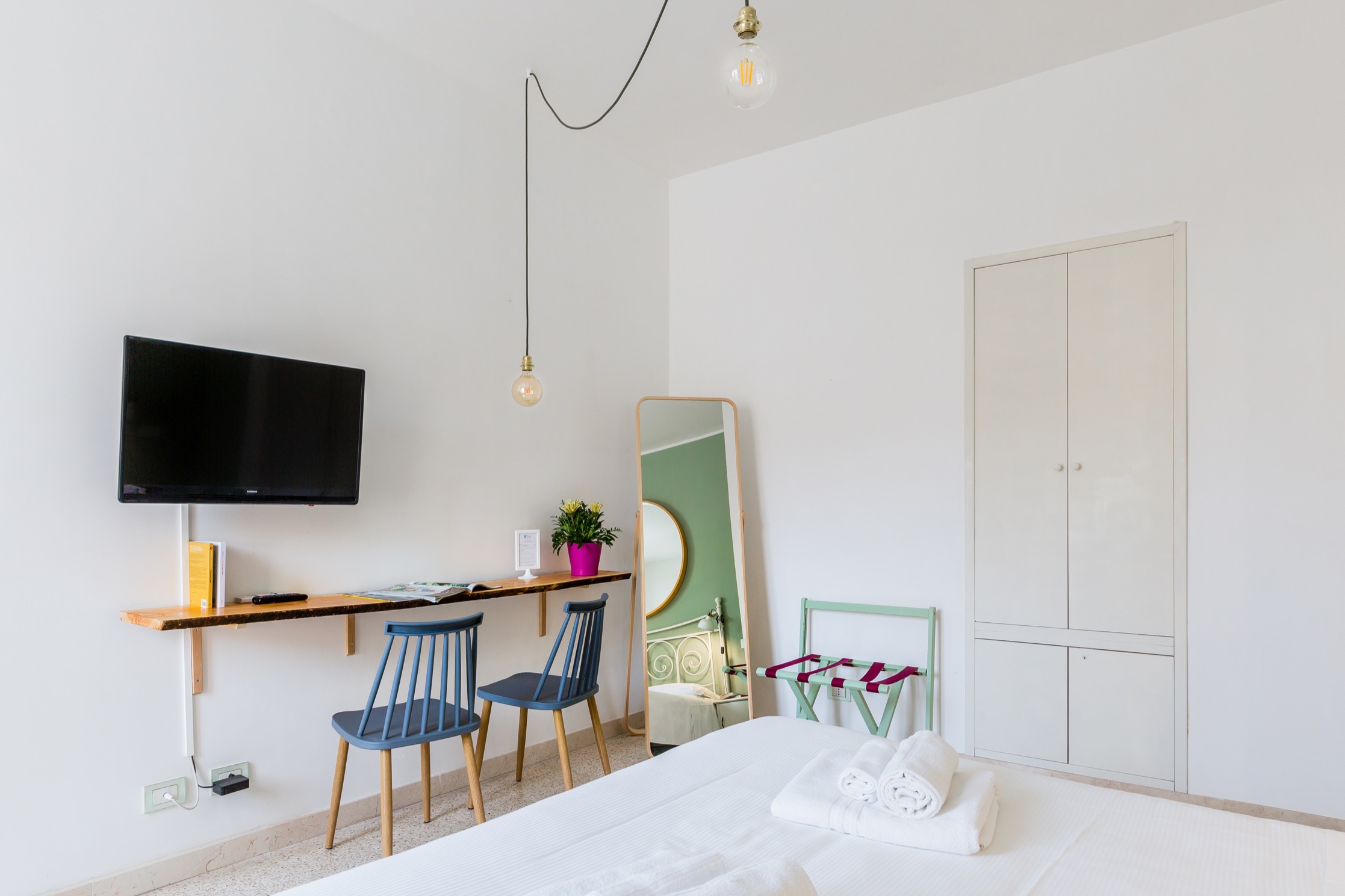 Alle due Camere del primo piano si accede dalla zona living che ospita anche una piccola cucina con frigorifero. I mobili antichi si integrano con armonia a quelli moderni come l’originale divano azzurro ed ai quadri che animano le bianche pareti: sono opere di alcuni esponenti del Gruppo di Scicli.