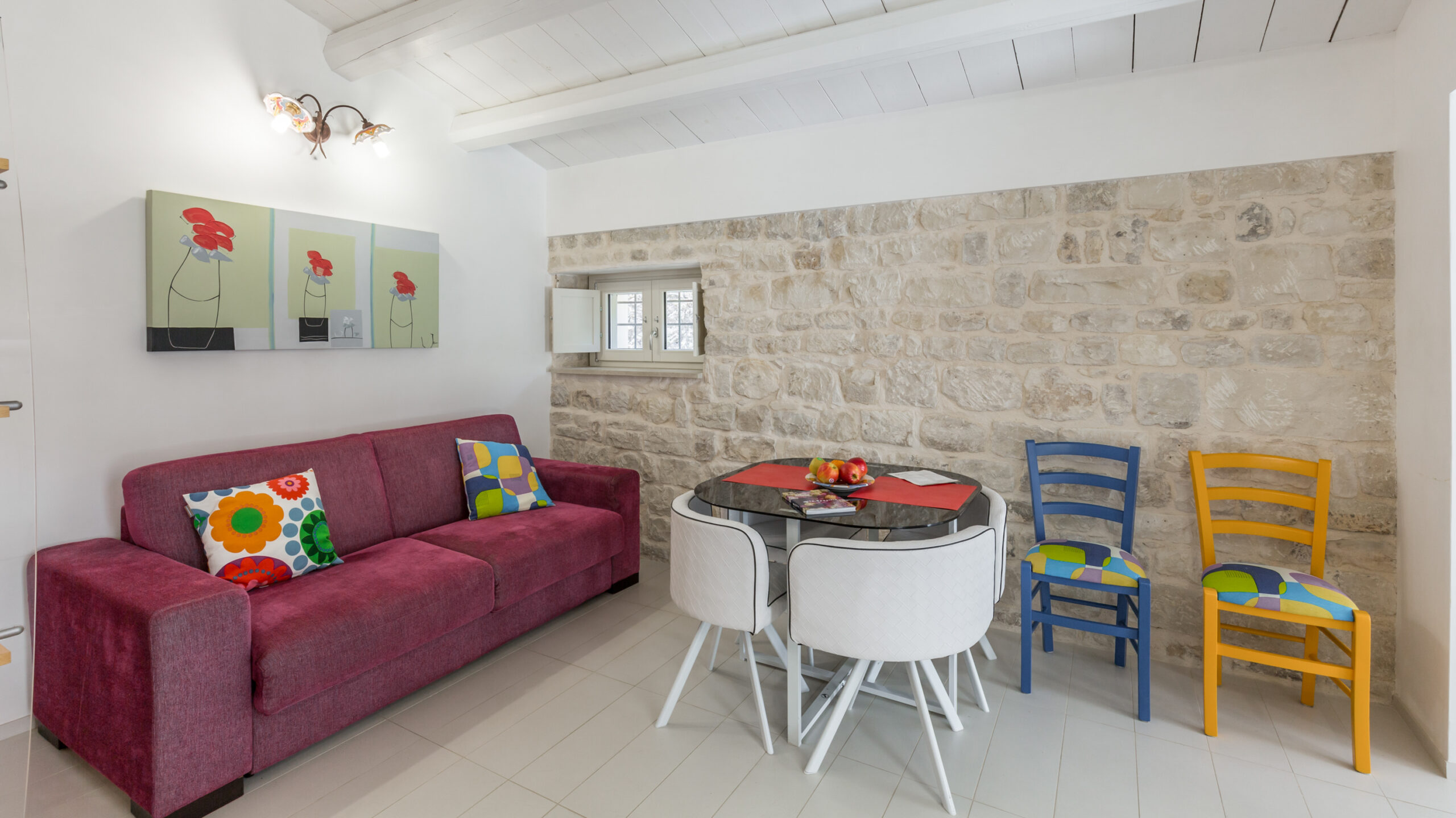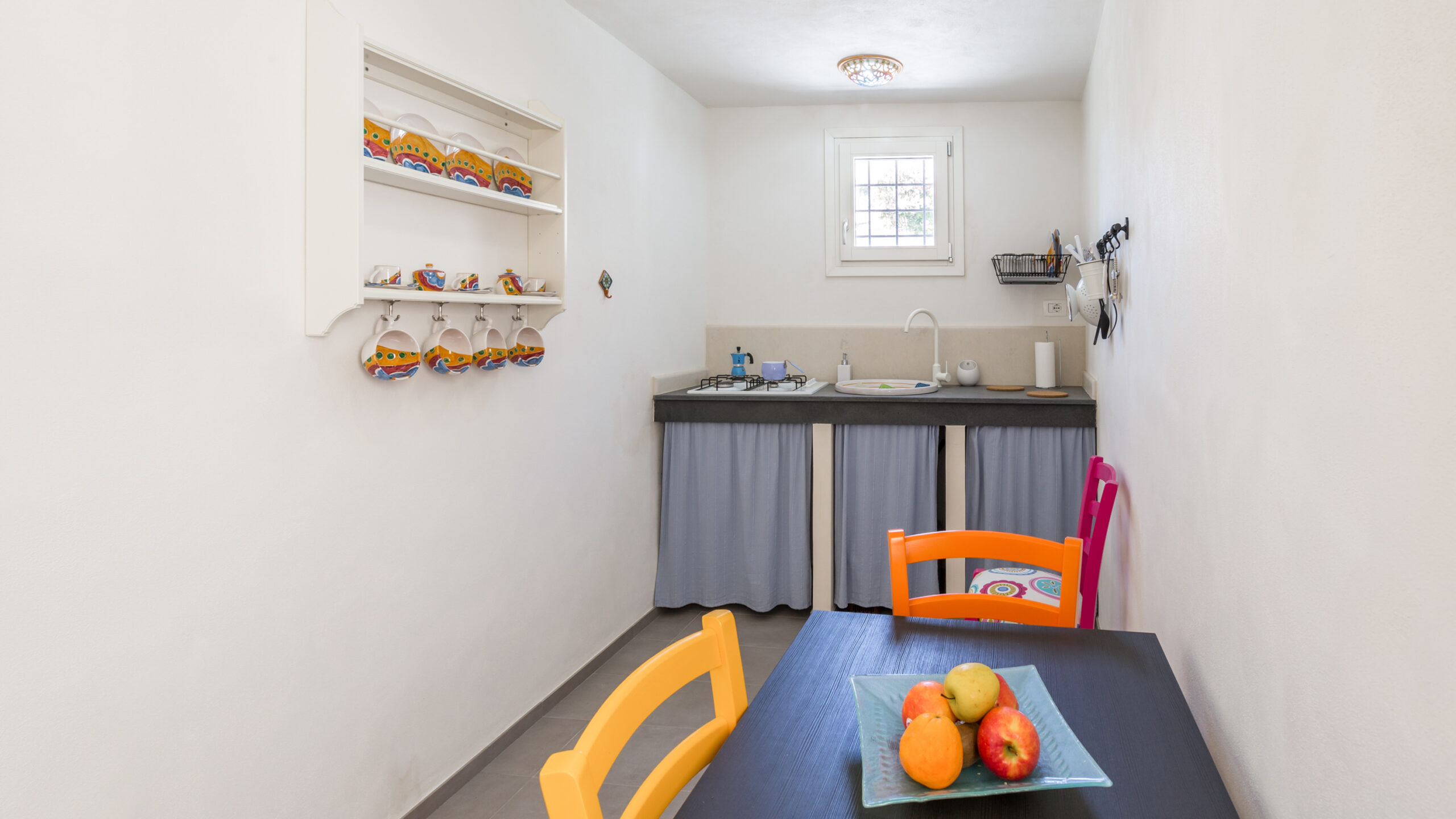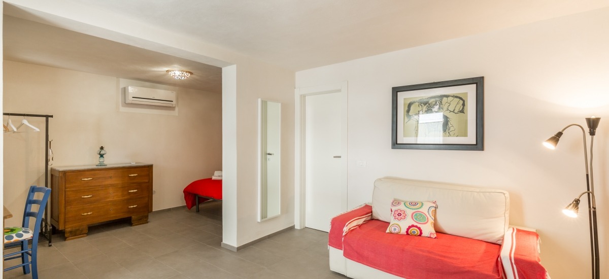 Situato al piano terra della stessa struttura, questo delizioso appartamentino è anch’esso l’ideale per una coppia o una famiglia di tre persone, essendo dotato di un unico grande openspace con camera da letto, zona living con divano-letto e una confortevole cucina.