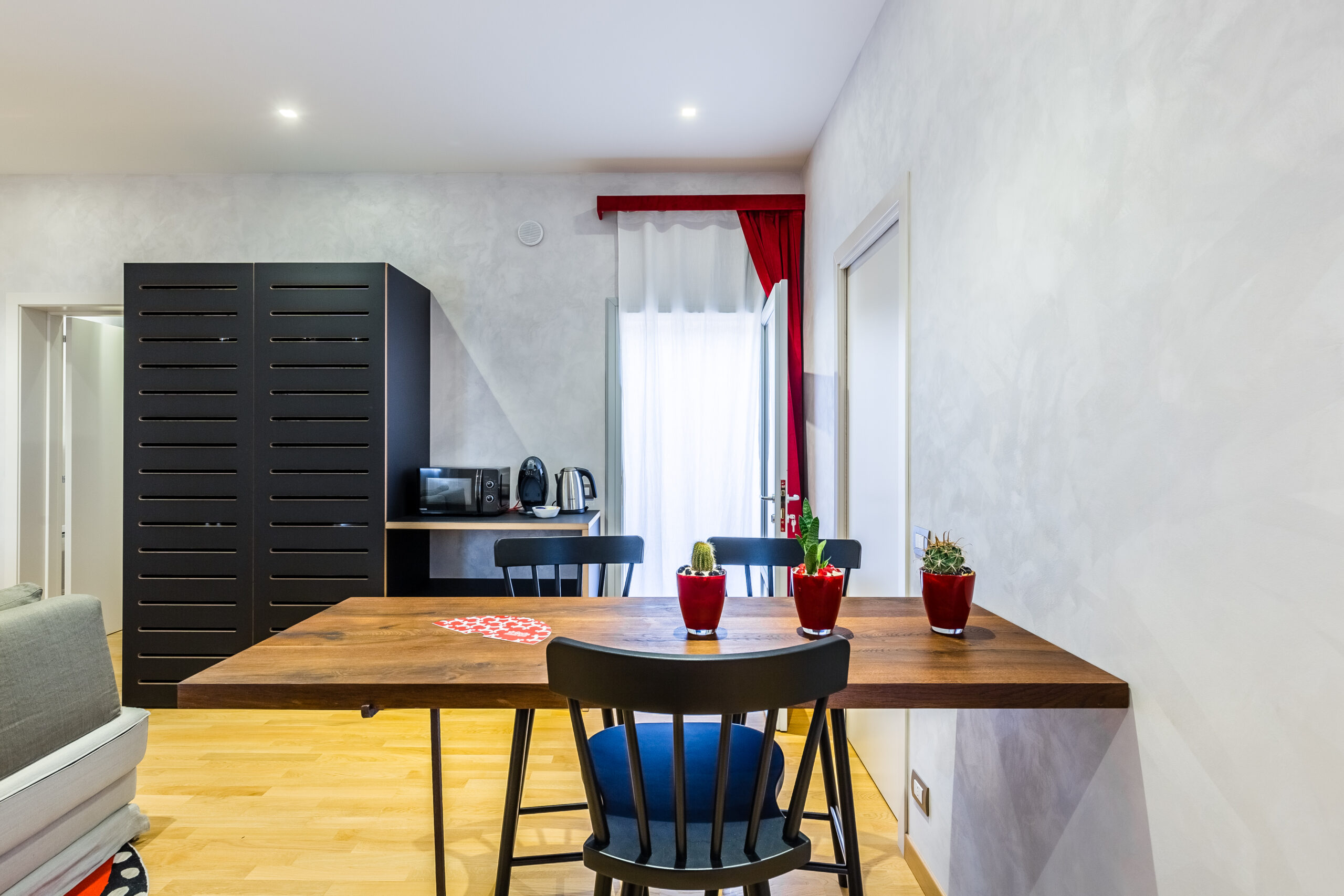 L’ingresso si apre nell’area living arricchita da un comodo sofà, dalla zona entertainment con televisore e dal tavolo da pranzo arredato con sedie rialzate tipo bar.