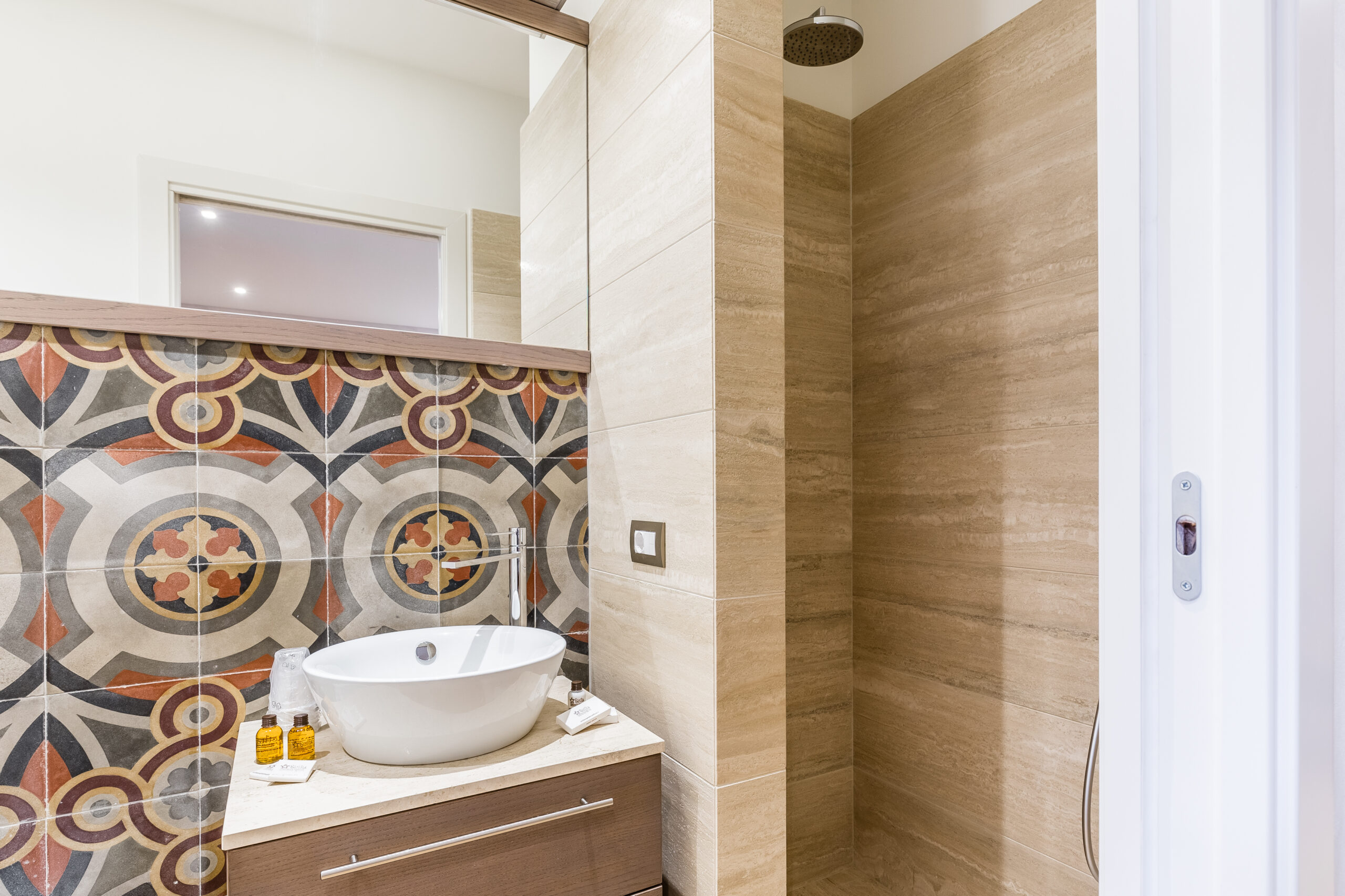Il bagno, dotato di una grande doccia, ha il lavabo a vaso e sanitari in bianca porcellana.