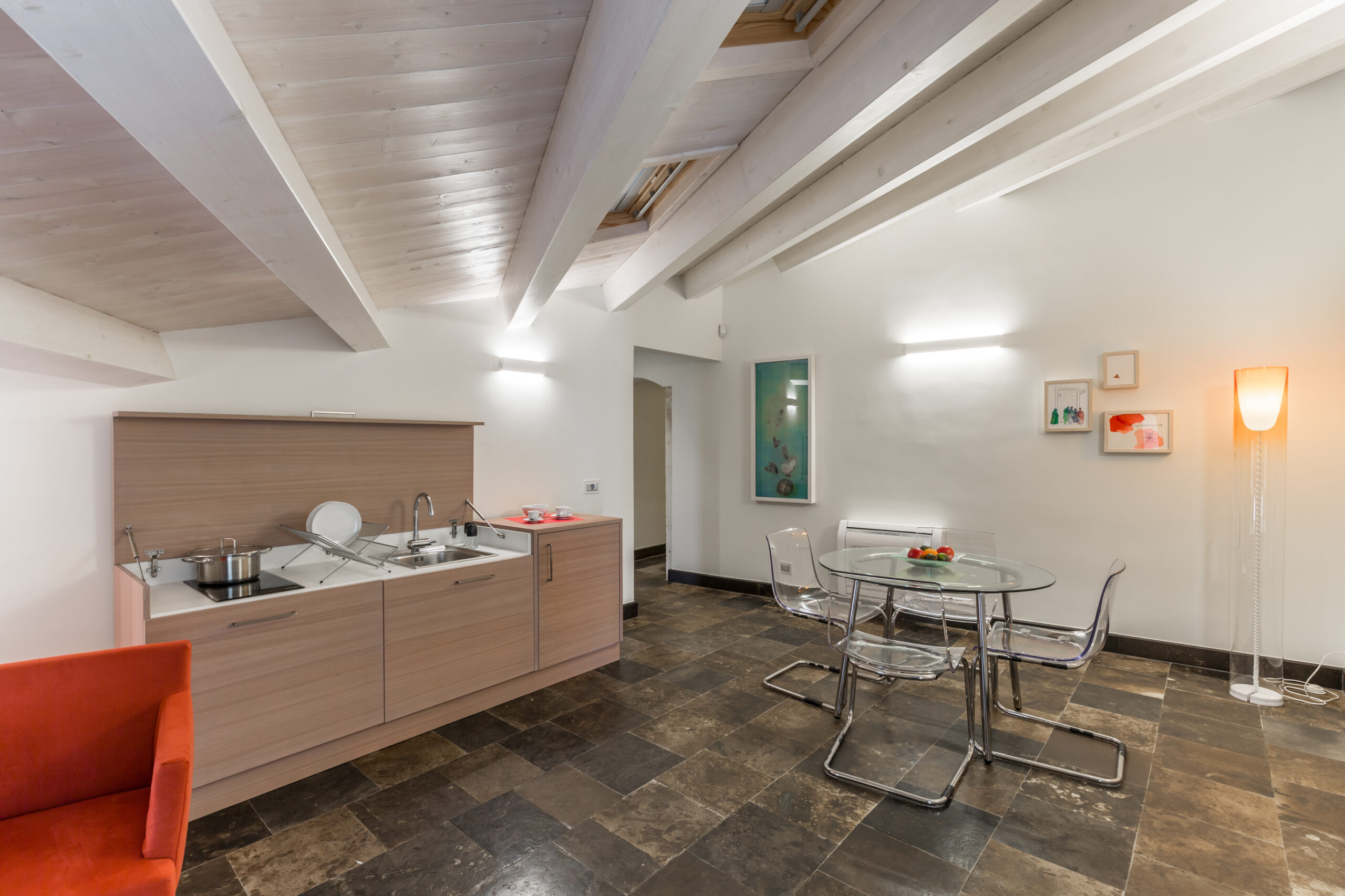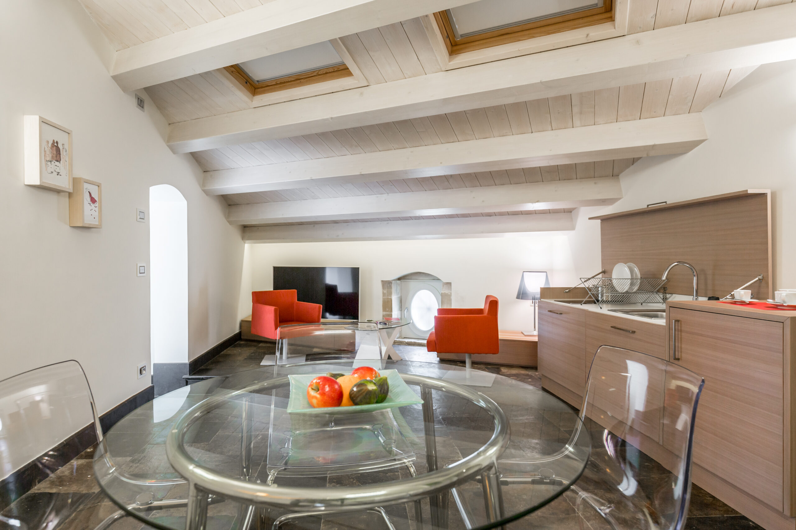 All’entrata si apre direttamente la zona living con angolo relax con grande TV LCD e mobile cucina, illuminata, come il resto delle camere da finestre a velux collocate tra le travi in legno del soffitto e apribili elettronicamente.